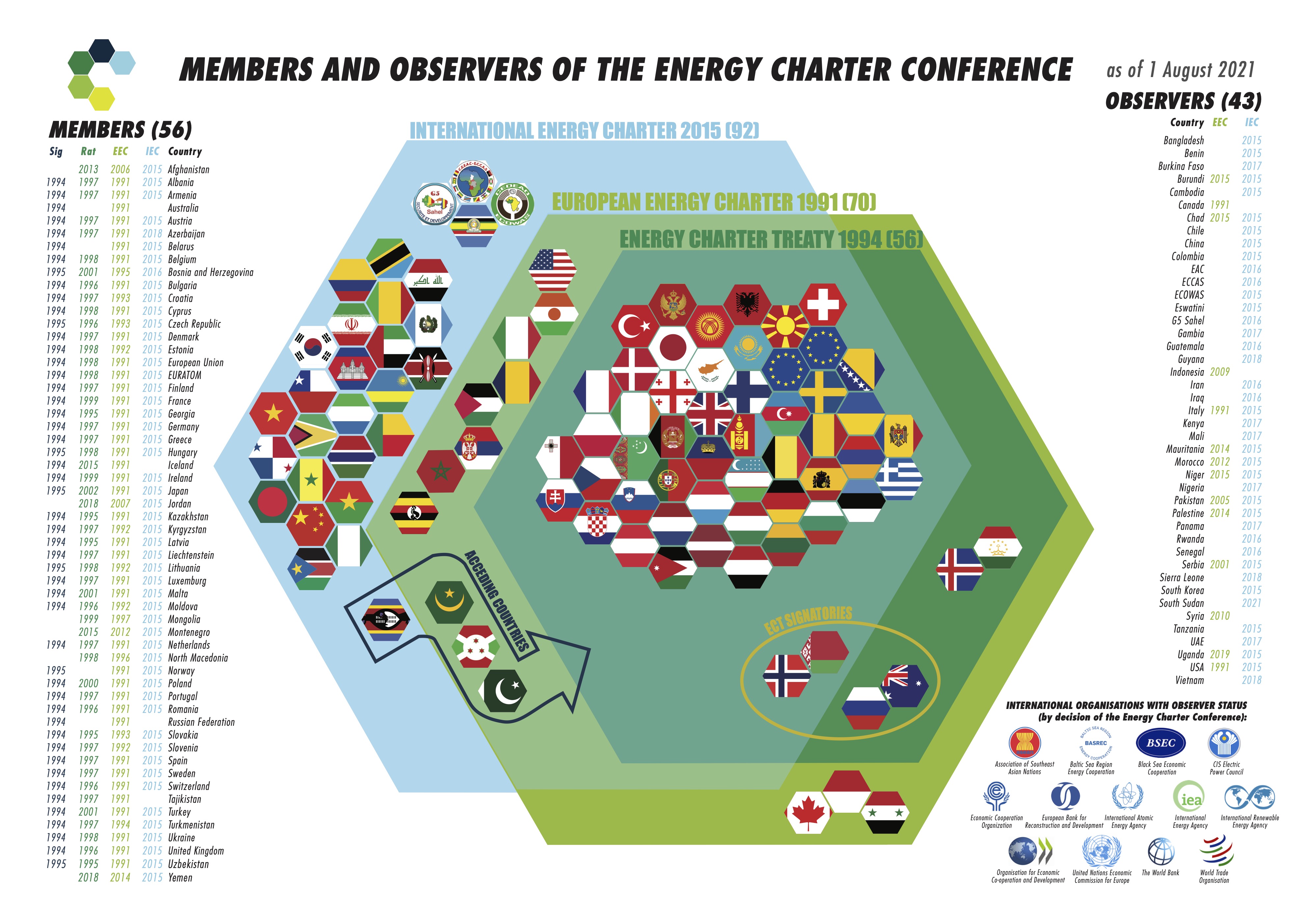 The Energy Charter Treaty (ECT) is one such regulatory and political tool to which the EU and its member states are signatories. Concluded as a multilateral treaty in 1990s, the ECT aimed at opening trade, facilitating energy transit, protecting private investment, and providing an international arbitration mechanism for resolving disputes between investors and states. Its 56 members include countries in Europe, Central Asia, and Japan, with many more states outside of these regions being involved in the ECT process as nonbinding members, observers, or acceding states.